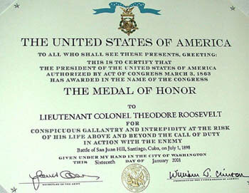 - Hneď po tom, ako vyhlásil vojnu a poslal Španielsku flotilu na jednosmernú cestu na dno skurveného oceánu, Roosevelt sa vzdal svojho postu Námestníka ministra a založil svoj vlastný, dobrovoľnícky pluk zvaný “Rough Riders” (“Drsní jazdci”). Vzal doňho kohokoľvek, kto sa chcel pridať, nehľadiac na rasu alebo vieru, a vydal sa na Kubu rozbíjať ksichty. V Bitke o kopec San Juan, rozhodujúcej bitke, ktorá uzavrela víťazstvo Američanov na Kube, získal Roosevelt Medal of Honor, za “výnimočnú chrabrosť a nebojácnosť” a bol povýšený na plukovníka.